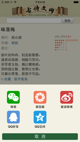 短评: 古诗文网作为传承经典的网站成立于2011年。古诗文网专注于古诗文服务,致力于让古诗文爱好者更便捷地发表及获取古诗文相关资料。
