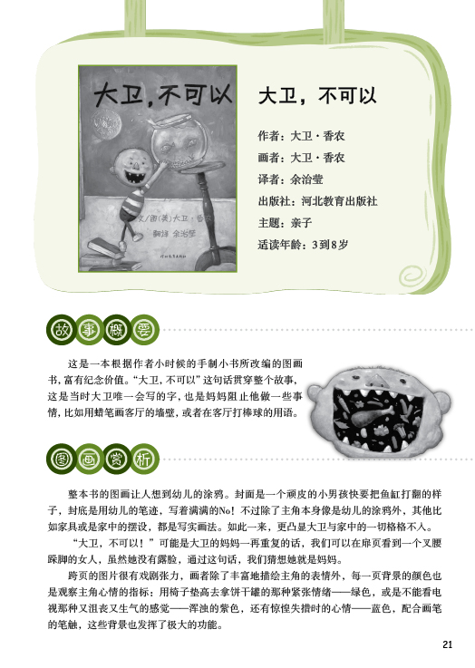 《绘本赏析与创意教学》中所精选出的25本经典名著绘本,包含了从儿童的自身出发、从而关怀他人、进而关心社会环境的主题内容,涵盖了生活常规(《大卫,不可以》)、学习认知(《小蓝和小黄》)、自我认同(《大脚丫跳芭蕾》)、家族情谊(《我爸爸》和《我妈妈》)、关怀他人与尊重生命(《獾的礼物》)、爱与分享(《小恩的秘密花园》)、关怀环境(《花婆婆》)、远离焦虑(《妈妈心·妈妈树》)、依附感(《阿文的小毯子》)、无私奉献(《爱心树》和《小石狮》)、爱惜大地(《西雅图酋长的宣言》)、喜爱阅读(《我喜欢书》)、认识情绪(《子儿,吐吐》)、家庭温馨(《云朵面包》)、热爱乡土(《荷花镇的早市》)、关怀弱势(《妈妈的红沙发》)、多元观点(《三只小猪的真实故事》)、珍惜友谊(《我有友情要出租》)、单亲儿童的孤独(《大猩猩》)、执着与分享(《雪花人》)等。丰富的主题内容足以供各学段教学者学习、参考之用。
