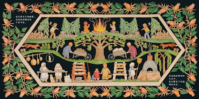 帕梅拉?道尔顿已熟练掌握剪纸技艺超过二十五年。剪纸的历史可以上溯到十六世纪的德国和瑞士,十八世纪时期,来自德国的移居者将这一技艺带到了美国。《日月颂歌》是帕梅拉为孩子创作的第一本书,其中的每一幅插画都是从一张连续的纸上剪下来的。