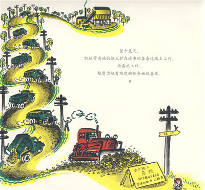 凯迪是一台漂亮的履带式拖拉机,55马力,既能推土又能铲雪,越是有难度的任务她越喜欢。有一天下了很厚很厚的大雪,别的铲雪车都走不动了,城市的路全被雪封住,除了凯迪,一切人、一切事情都停了下来。慢慢地、稳稳地,凯迪犁着雪前进,一路上帮助警察出来保护城市,邮递员把信送出去等等。多亏了能干的铲雪车凯迪,城市的所有道路恢复畅通,生活又照常进行了。