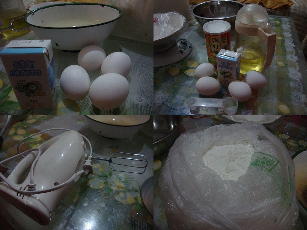 家里有个闲置的烤箱,是买东西的赠品,容量比较小,所以没有好好利用,之前充其量就是烤烤地瓜,做过两次蛋挞,还是很成功的。今天和萱萱一起动手做了蛋糕,小姑娘很高兴。唯一遗憾的是今天不知怎么不合适,吃的东西全吐了,身体不是很舒服,但我准备做蛋糕的时候,她依然是很积极地参与进来,帮我拿这个拿那个的。下面是做蛋糕的材料,图片是晚上拍的,所以不大清楚。