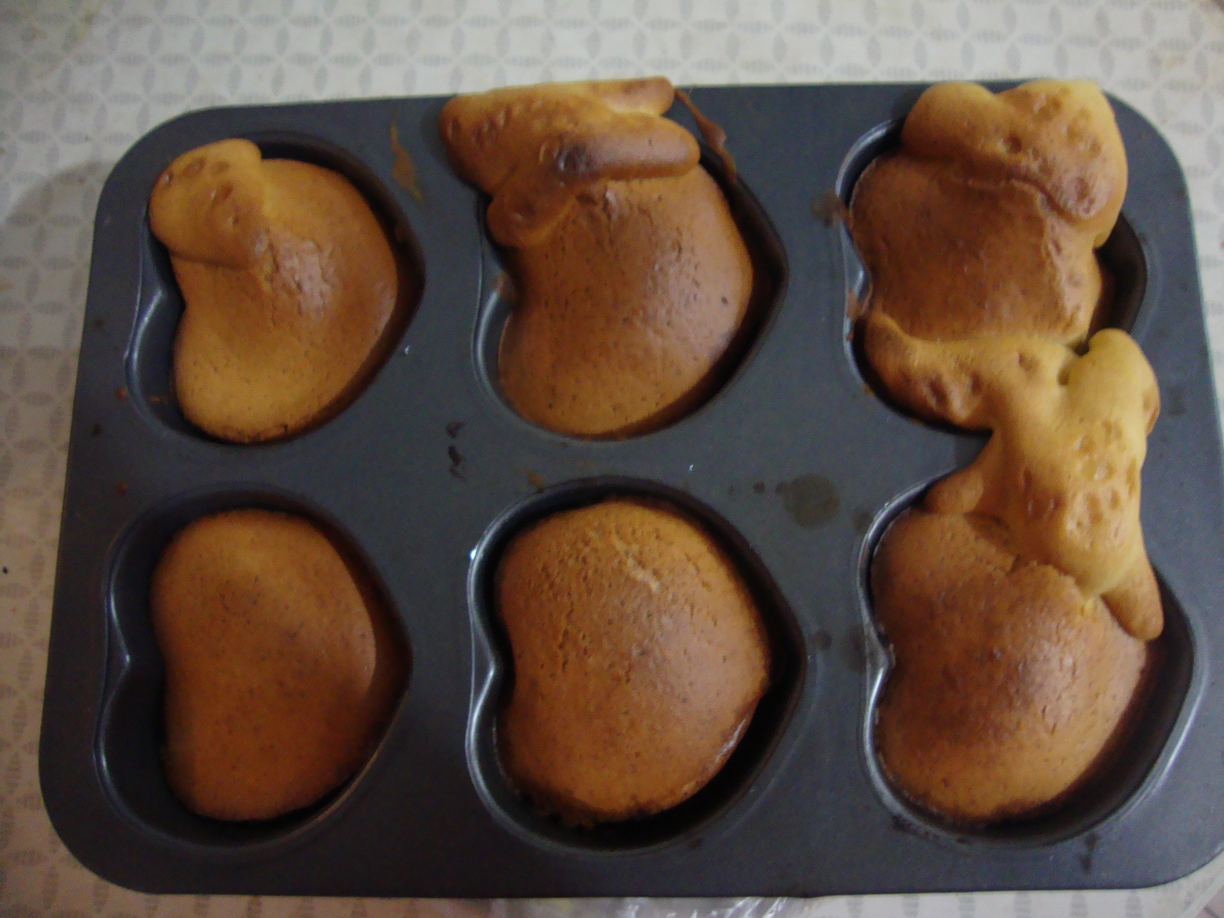 蛋糕的模子抹点油,防止粘面。烤箱200度预热5分钟,倒入面糊糊。由于烤箱很小,先是180度10分钟,150度10分钟,120度5分钟。下面看看效果图,比不上卖的好看,但是这是自己亲手做的,吃起来觉得很不错。