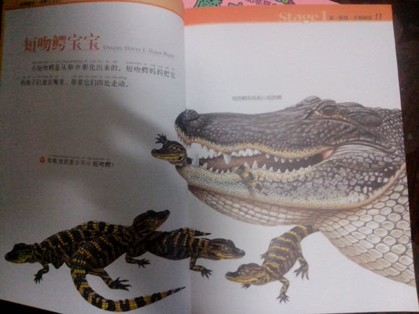 讲到短吻鳄妈妈和小短吻鳄那一页,“小短吻鳄是从卵中孵化出来的。短吻鳄妈妈把它的孩子们放在嘴里,带着它们四处走动。”