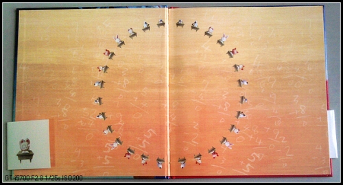 展开封面,橘色的纸面上,一道道考题看得人发晕,短耳兔和她的朋友们围了一个圆圈,表情各异,仔细看看,到底有几个小朋友?(我一开始以为是说孩子们考试压力大就是受了这张图片影响,后来才发现,是7个小朋友出现了4遍,哈哈)知道为什么会围成一圈吗?想想看,像不像一个零分?