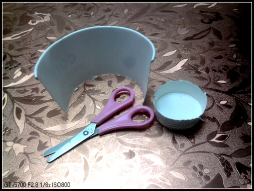 跟婷商量是用电光纸还是皱纹纸做花茎和花叶,婷选了电光纸。粘贴在纸杯的剩余材料上,然后剪贴。