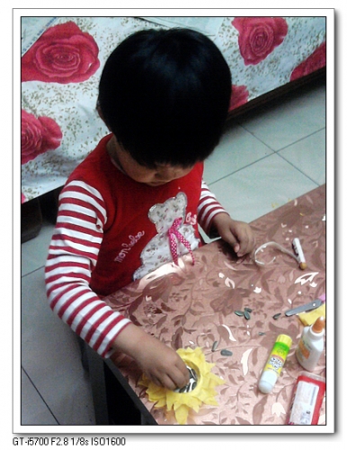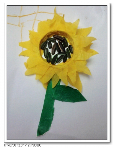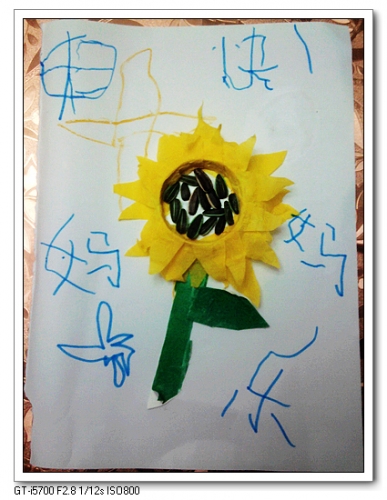 剪了一条皱纹纸,叠了许多层,然后剪出花瓣来,我一再强调花瓣大点大点,婷却一意孤行,小小的花瓣。贴啊贴,贴花瓣,婷宝贝不耐烦了,也许是因为薄薄的皱纹纸老往手上粘,也许是因为粘贴工作太枯燥没技术含量,请妈妈来帮忙。妈妈本想偷个懒,没想到婷更懒啊,于是妈妈一边粘贴,一边叨叨了几句,叨叨完又落入无尽的悔恨中(为啥我对孩子这么苛责呢?为啥我对孩子这么没耐心呢?)