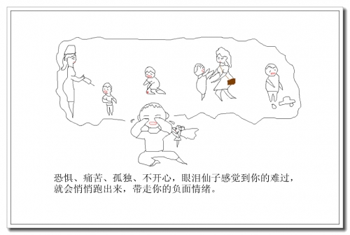打针、摔倒、妈妈去上班、心爱的玩具坏了,恐惧、痛苦、孤独、不开心,眼泪仙子感觉到你的难过,就会悄悄跑出来,带走你的负面情绪。
