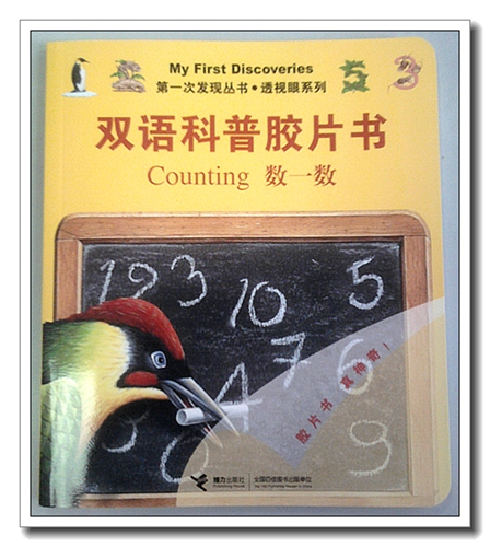 《双语科普胶片书》是《第一次发现.透视眼系列》中的一套,为英汉双语。《数一数》有26页,4张胶片,其中三张胶片双面印刷,正反面不同。书的质量极佳,图片颜色鲜艳,纹理清晰,栩栩如生。