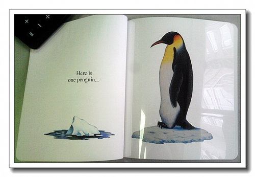 看懂了文字,再来看书,就发现非常有趣了。这是一只企鹅,翻过胶片,如果粗心,就只注意到那个数字1了,可是仔细看,哈哈,企鹅的脚下,多了一只小企鹅,好可爱(文字是:一只企鹅藏起了……一只企鹅宝宝)。