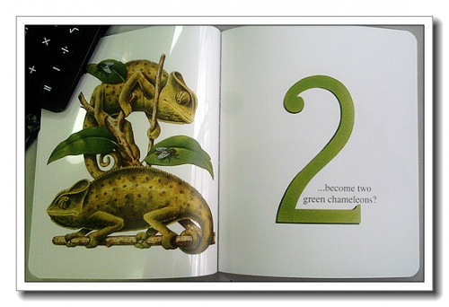 一开篇,书本就告诉孩子们:“大自然中充满了数字”,“学数数有趣有有用。”打开后,我先为自己的英语汗颜了一下,再仔细看看,还好还好,除了蜥蜴、蚱蜢、狐猴什么的不认识,其他还是能看懂的,就是不敢读(翻到最后才发现后面有中文翻译,不用担心看不懂——哎,我都忘了这是一本双语书了)。