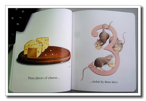 下一页,画着3块奶酪,这边,3只可爱的老鼠挂在3上,我还以为只是放了两个同样是3的物体对比,看文字,才知道,是3块奶酪被3只老鼠偷吃了,数字的一一对应哦。