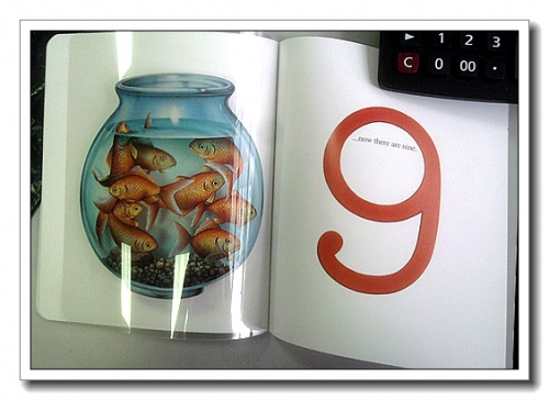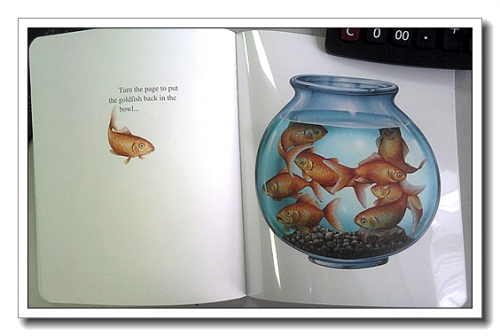 9这页设计业很棒,为什么只有一条金鱼?胶片上的金鱼也不是九条啊?原来,要把胶片翻过去,画面上那条孤单的金鱼正好回到了鱼缸中,仔细看,正反不相同哦,那条鱼尾巴是什么时候多出来的?这条鱼又是什么时候跑出来透气的?
