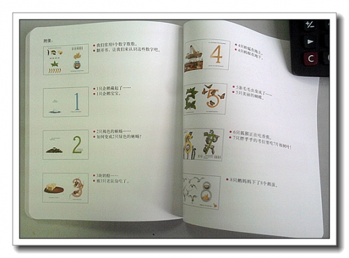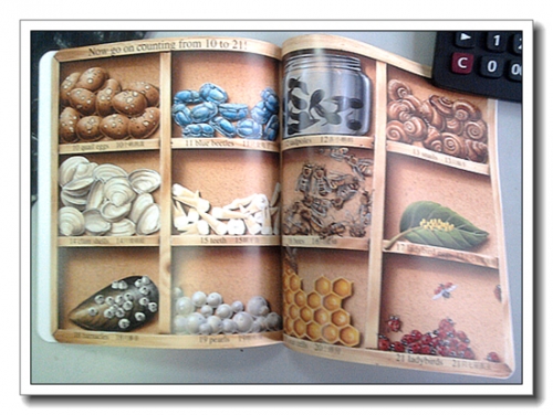 0这页画得有点深奥,是想说明0不代表什么都没有,它也是一个数字,可是我没看出图片有什么意义,难道是一根羽毛代表1,配上0变成了10?可是地上鸟儿的脚印也不是10只/双啊。也许是什么意义也没有,我多虑了。