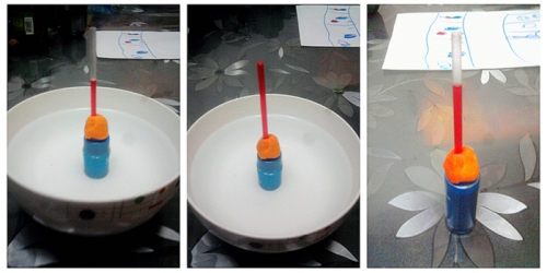 2.插入吸管(露出瓶口的部分留得长一点),用橡皮泥封口;