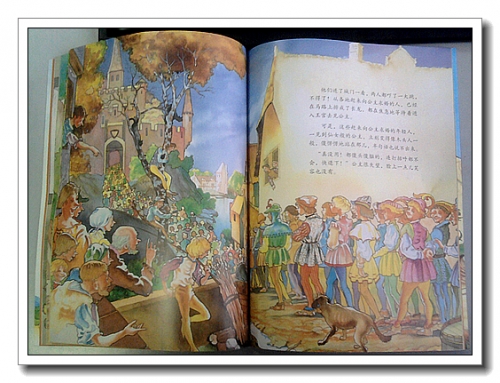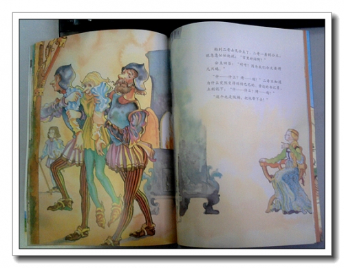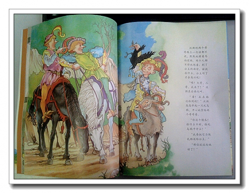 西洋画风,颜色很鲜艳。封面上的小汉斯骑着山羊,提着鞋子,背着乌鸦,雄赳赳气昂昂得前进。没急着看故事,先读读金波老师的序诗,字里行间透着浓浓书香,故事从来就不仅仅只是故事,而是孩子们飞翔的起点。翻开,一个指示牌,引导我们走进故事,那几颗圆点,就像长长的省略号。画里面的人物有一点粗犷,马匹却是超级逼真。人物衣饰、建筑非常有西方特色,那高高的尖鼻子,让我一下子就想到了匹诺曹。我小时候只是单纯的读过文字,我的宝宝却可以通过汉斯头上的帽子、男人们身上的裙子、武士头上的头盔以及宝座、王冠和权杖对古代的西方有一个简单的印象。