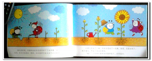 这个故事里告诉我们向日葵的花总是朝着太阳的,还画出了向日葵成长的过程。小蜗牛、小瓢虫、小蜜蜂的家都各有特点,婷和我仔细找着能代表他们特色的地方。婷特别关注向日葵的表情,再见的时候、伤心的时候、被包扎了微笑的时候。