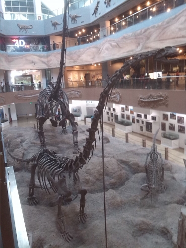 在恐龙馆里,展区展示了“中加恐龙项目”和2006年采集到的恐龙化石和复原骨架。那最大的恐龙复原骨架约三十来米,我们在一层可平视恐龙巨大的角趾,爬到三楼才能看到它的头颅,人在它面前,显得十分的渺小。