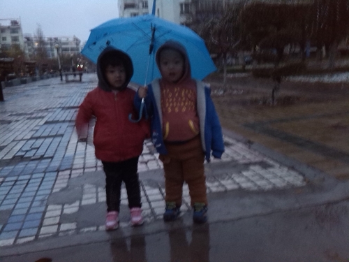 魏宝以最快的速度下楼,去打开他的小伞,我们在回家的路上和果果一起回家,魏宝还给果果撑伞,好绅士的样子,看他们俩都好开心的。