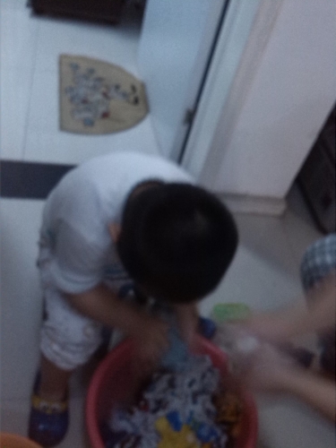 魏宝愿意做的事情之一就是洗衣服了,今天我要魏宝的爸爸去给魏宝洗衣服,他就叫魏宝一起洗衣服,魏宝可高兴的跑了去。 魏宝的爸爸要魏宝洗他自己的小短裤和袜子,把魏宝忙的老是和爸爸强着用洗衣液,衣服没有洗多少,我家的洗衣液我看到是挺遭殃的。