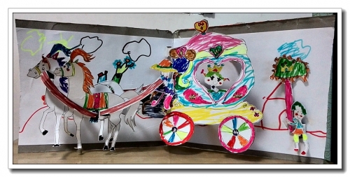先在纸上画图样,我画了马和车,其他的都是婷画的,公主、侍从、背景,公主很漂亮,侍卫很精神,背景也挺热闹,可惜一粘贴被挡住了不少。上色自然也是婷的工作。