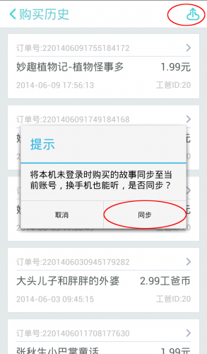 4.3版本支持将未登录状态下购买的故事同步到您的工爸账号。方法:进入【口袋-购买历史】,点击右上角的云图标即可。