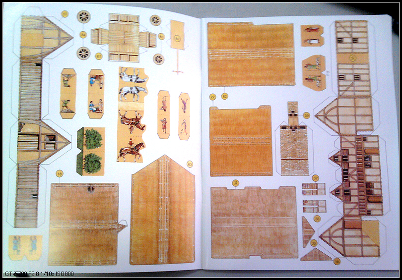 翻开内页,先被封二大量的文字小小震撼了一下——好复杂啊,不过仔细去看图,其实也没那么复杂。沿着书上的线条剪下来,然后按照标记折起来就行了,还有编号,一一对应指示。最简单的就是人物和树、马,剪下来对折就可以。画面非常精美,人物衣饰清晰可见,房子门窗、屋顶材质细腻逼真。