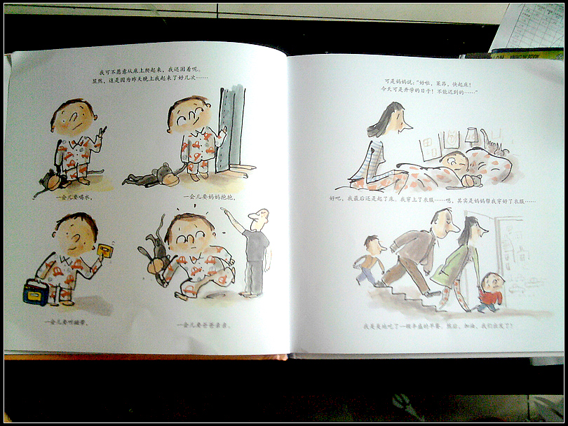 我是从这页开始喜欢上的,小主人公可能有些幼儿园焦虑症,上学前一天又是要这样,又是要那样,一晚上没睡好,虽然宝宝没有这样,不过我相信,图画中的事情还是很多孩子会遇到的。