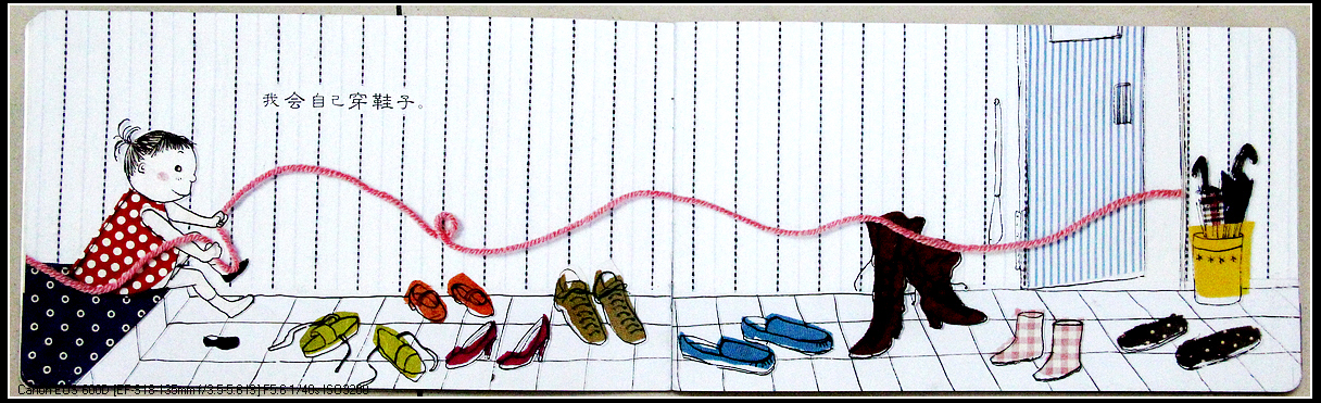 婷婷会自己穿鞋子,宝宝,你会吗?啊,婷婷用粉红线在做什么?地上好多鞋子啊,都有哪些鞋子呢?猜猜看都是谁的呢?